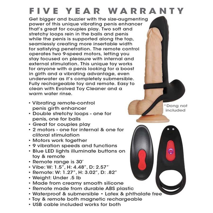 Get bigger and buzzier with the size-augmenting power of this unique vibrating penis enhancer that’s great for couples play. Two soft and stretchy loops rein in the balls and penis while the penis is supported along the top, seamlessly creating more insertable width for satisfying penetration.