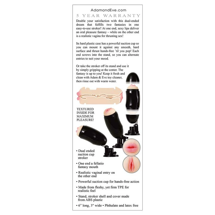 - Fulfill two fantasies in one with this dual-ended suction cup stroker that serves as a realistic mouth and vagina