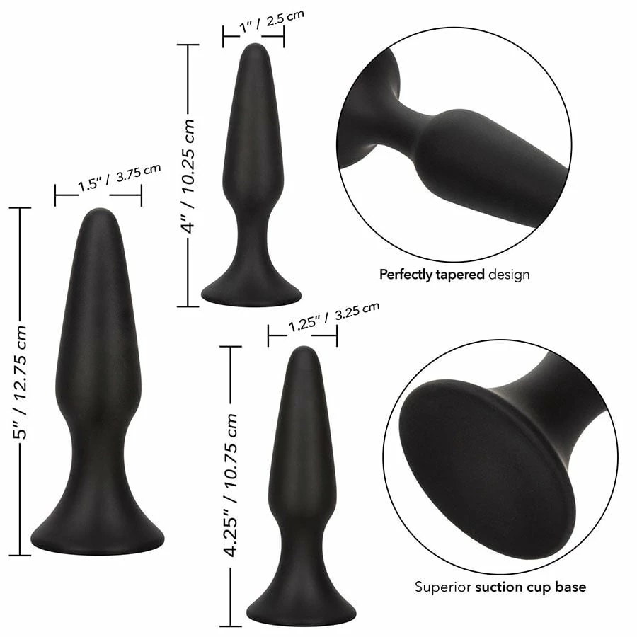 - Enhance your pleasure with 3 graduated sizes of tapered silicone anal plugs