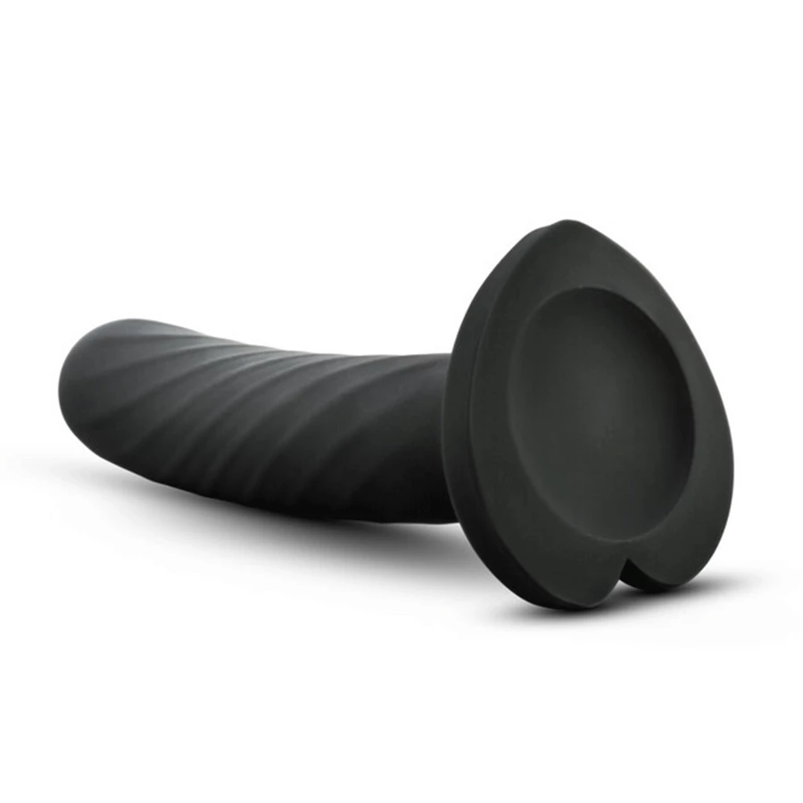 The Temptasia Twist Black Silicone Dildo features a swirling surface and slim shape. It has a heart-shaped suction cup base that is also compatible with a harness. This premium dildo can be used either solo or with a partner.