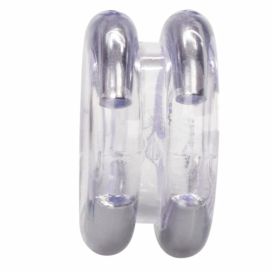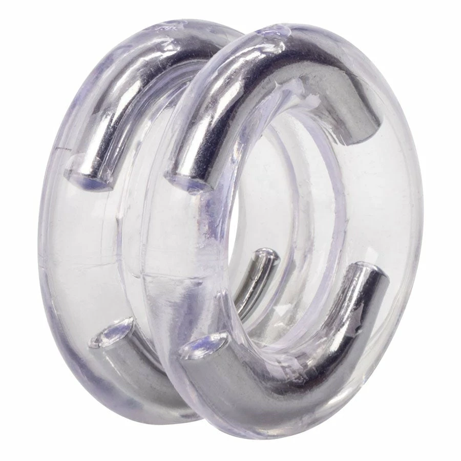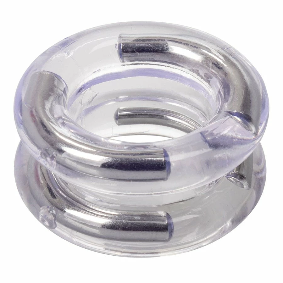 The dual semi-circle stainless steel rings support the shaft to aid sexual stamina. Safely and comfortably increase your endurance with this cock ring from Cal Exotics.
