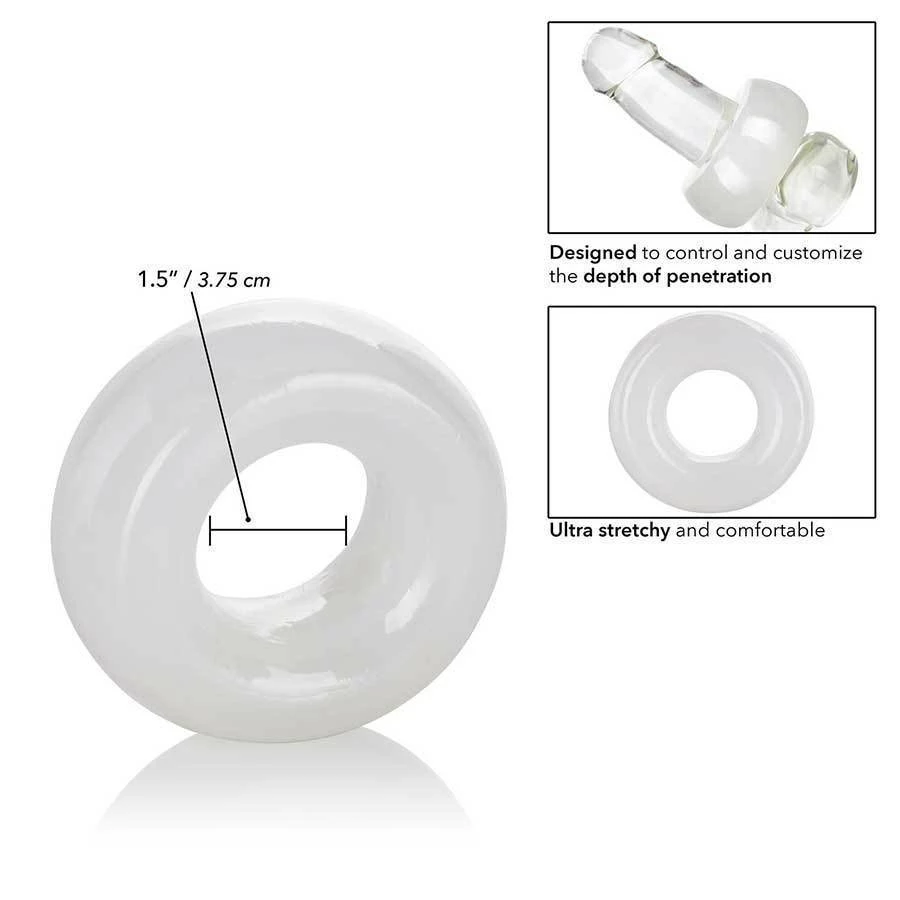 The 1.5-inch silicone ring fits snuggly on you to provide a soft, pillow-y cushion for your partner. The stretchy ring gives you total control of penetration depth for ultimate comfortable penetration.