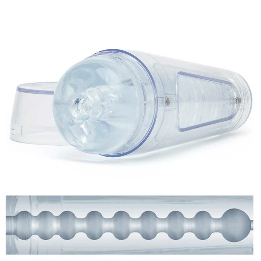 Housed inside of the case is the ULTRASKIN TPR masturbator sleeve that is also crystal clear. The TPR is extremely soft and stretching so it really feels like a person, especially if you warm it up in warm water or with a warming rod. The inner channel of the sleeve is ribbed with soft bumps that will stimulate the shaft and tip of your penis all the way to the climax.