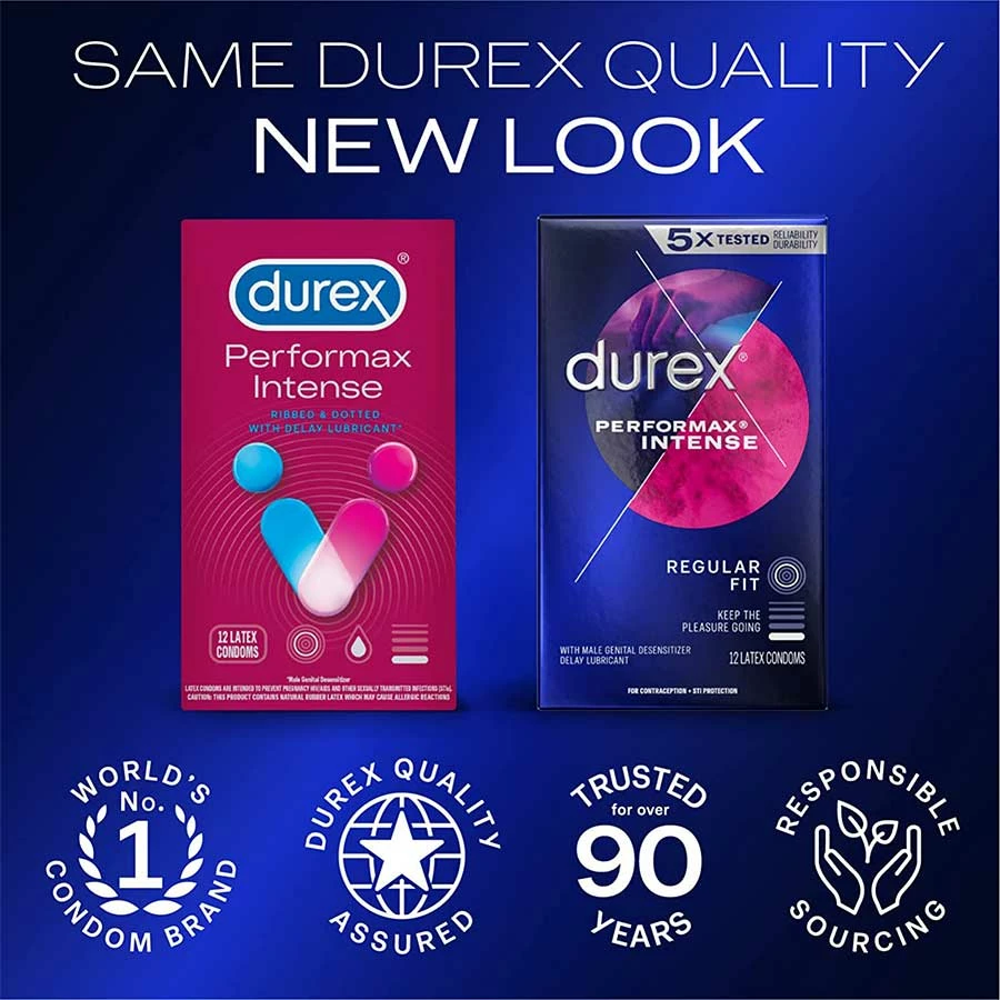 Designed to speed her up and slow him down, Durex Performax Intense latex condoms are ribbed, dotted, and lubricated to intensify sensation featuring a special delay lubricant that prolongs sexual performance and provides a more intense experience for you both.