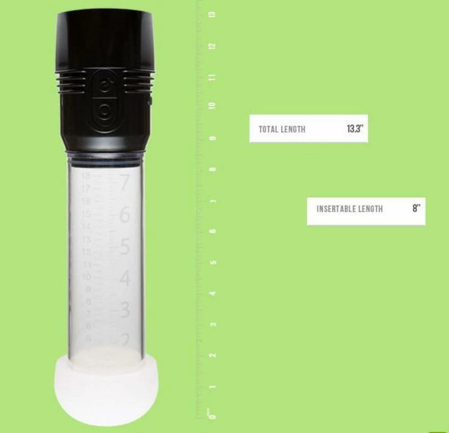 The overall length of this unit is over 13 inches which makes it one of the bigger pumps on the market. It will accommodate an already impressive 8 inch penis so most men should have no problem using this beast. The clear vacuum cylinder is made from crystal clear acrylic and includes a very handy measuring device right on it!