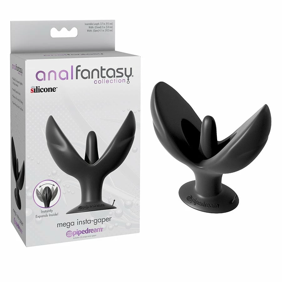 - Mega insta-gaper with a flexible tip that squeezes together for easy insertion and instantly expands when inside