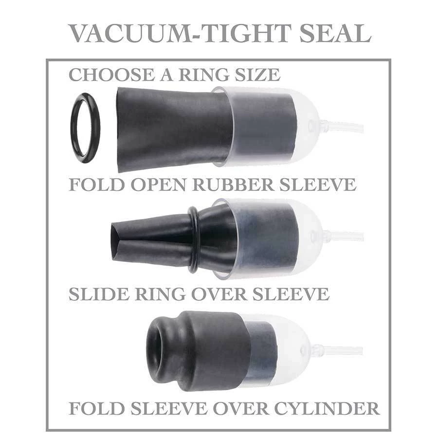 A short cylinder stabilizes the action while a length of transparent tubing adds lots of reach. Three variously sized silicone rings are included, these widen or tighten up the grip of a smooth rubber sleeve folded over the opening. Choose a ring and slip the sleeve through before folding the sleeve down around it and the cylinder.