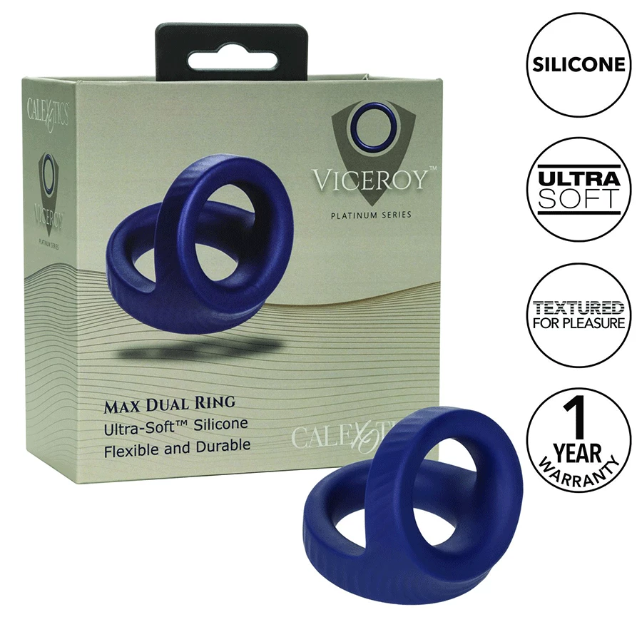 Keep your erectness intact until she’s shuddering in both of your completion with the Viceroy Max Dual Ring Blue Silicone Cock Ring by Cal Exotics!